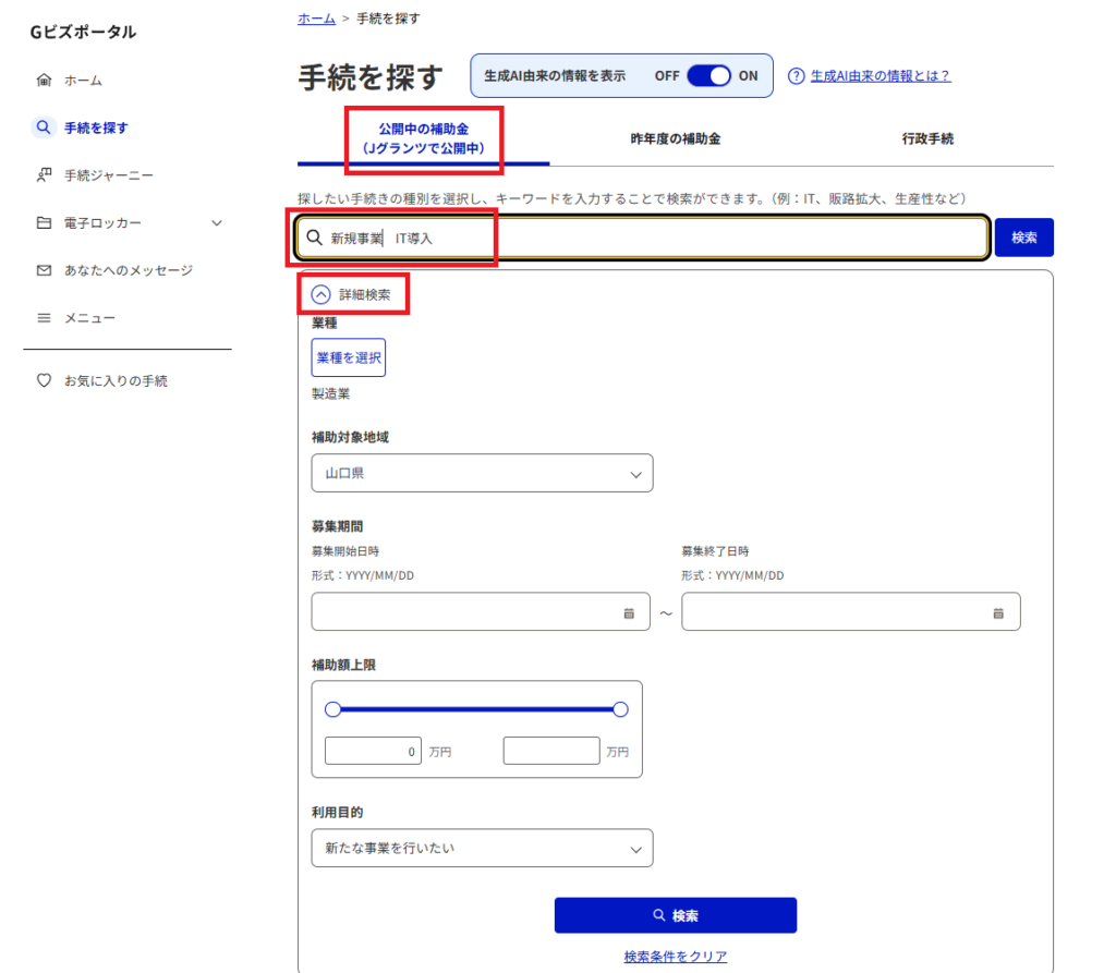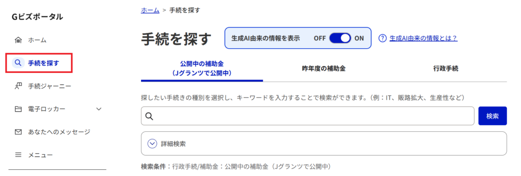 ここでは、公開中の補助金、昨年度の補助金、行政手続の検索ができます。
