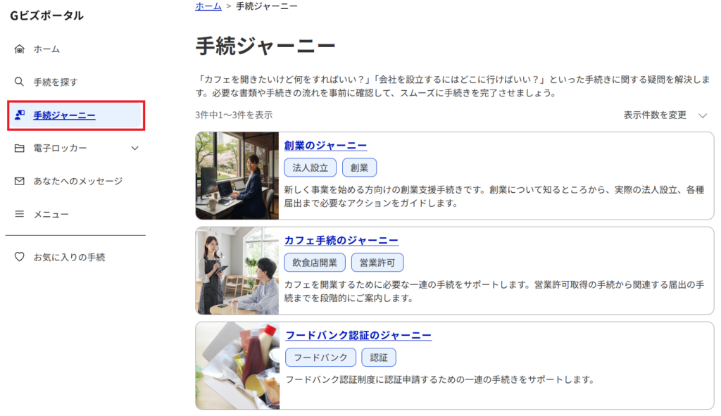 手続ジャーニーでは、実現したいことに関連した一連の行政手続を確認することができます。