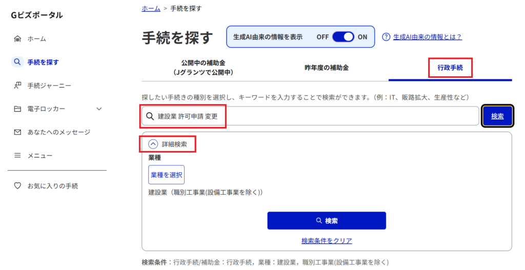 ①「行政手続」を選択し、検索キーワードを入力。次に「詳細検索」を開いて、条件を入力します。