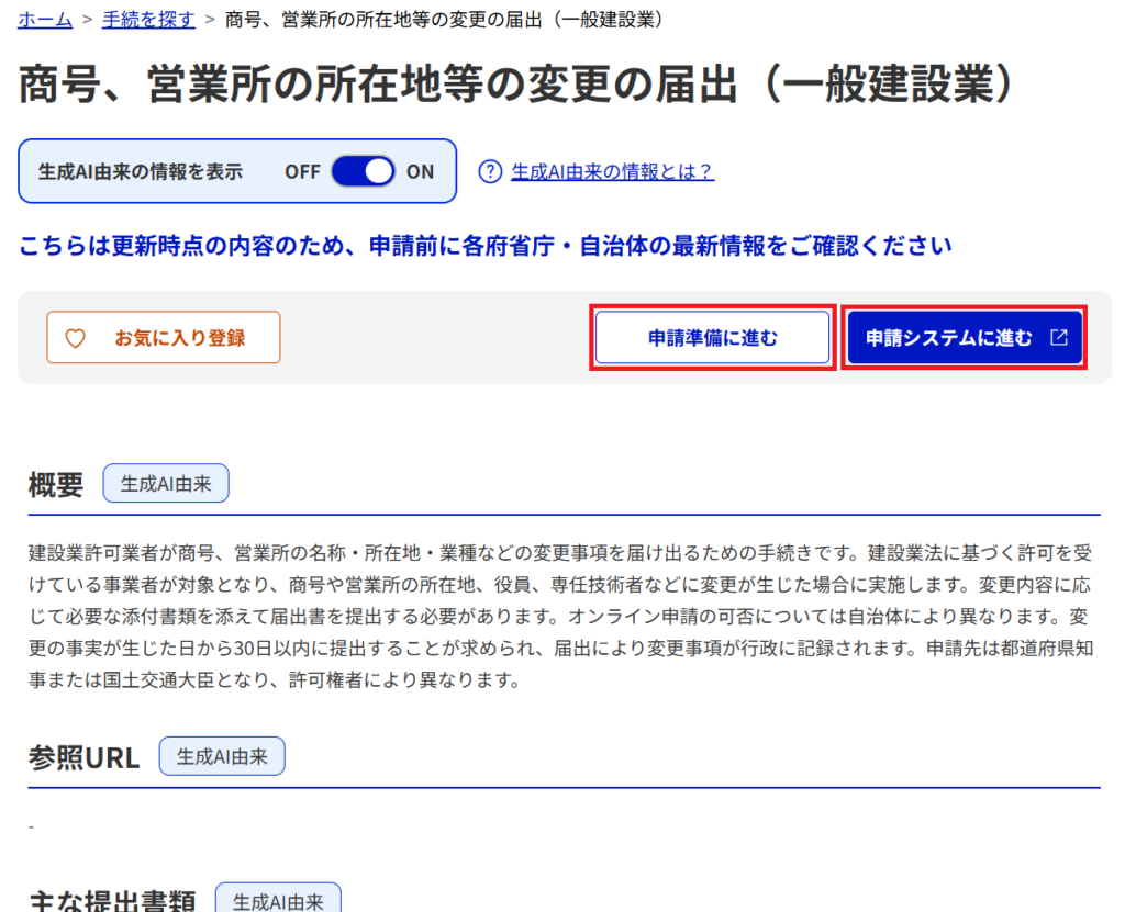 必要な手続きが俯瞰できますので、事業者だけでなく、行政書士にとっても役に立つ機能だと思います。