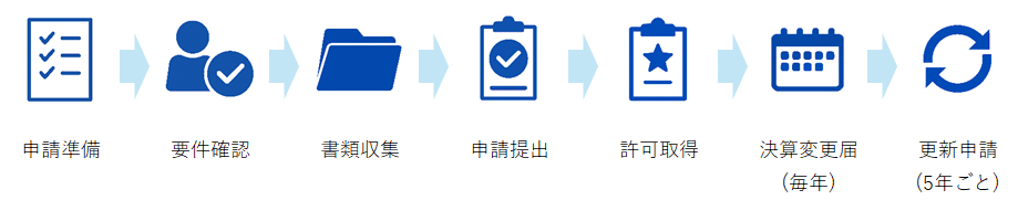 - 更新申請:許可の有効期限は5年。有効期限の30日前までに更新申請を実施
