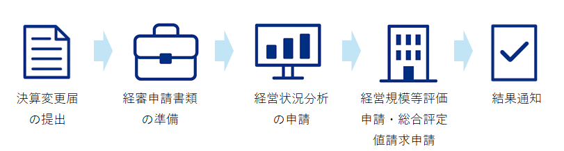 - 経営規模等評価申請、及び総合評定値請求申請:地方整備局または都道府県庁に申請